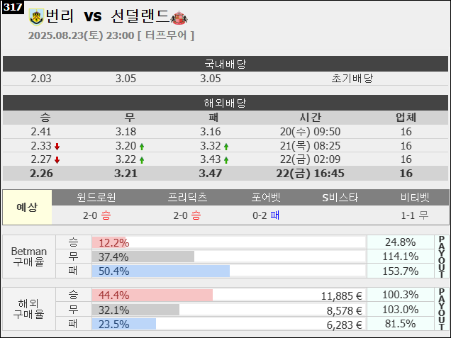 - 전반전: 번리가 홈 팬들의 응원 속에 초반 공세를 펼칠 것. 하지만 선덜랜드의 빠른 역습이 번리 뒷공간을 노릴 가능성 큼.