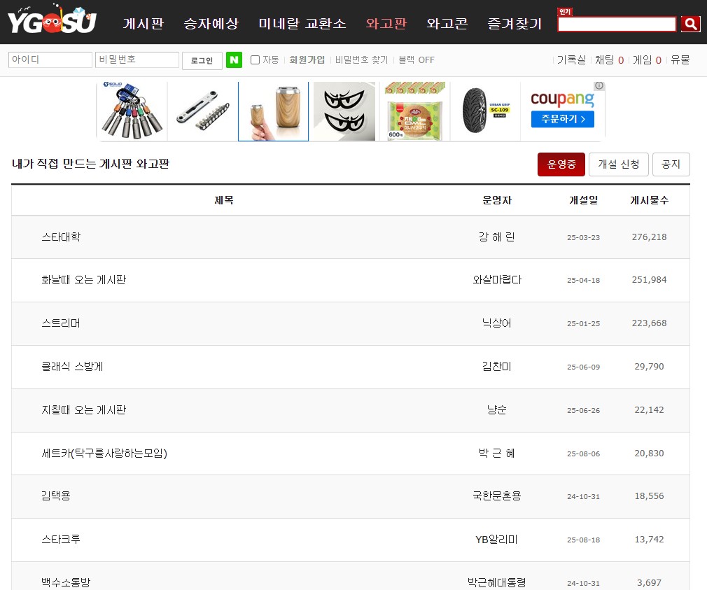 지금은 그냥 “와고”라고 줄여 불리죠. 와이고수는 유머 게시판부터 연애, 정치, 스포츠, 게임, 주식, 미스테리까지… 주제별로 다양한 게시판이 운영되는 종합 콘텐츠 플랫폼입니다. 특히 스타크래프트, 리그오브레전드 등 게임판은 물론이고, “승자예상” 게시판에서는 경기에 대한 예측과 분석이 활발하죠