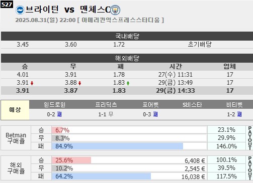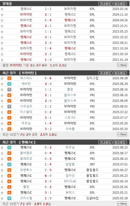 저는 이 경기를 **“경험의 시티가 야성의 브라이턴을 어떻게 통제하느냐”**의 시선으로 보고 있습니다. 데이터를 가볍게 뒤집을 수 있는 감정의 순간이 있다는 걸 믿기에, **“맨시티 승 + BTTS 흐름”**에 애정을 두고 싶어요.