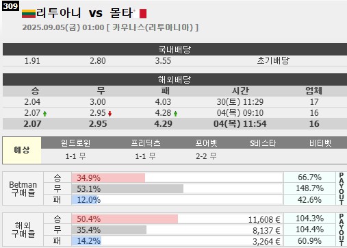 저는 리투아니아 승 + Under 2.5 Goals 흐름에 강한 신뢰를 둡니다. 감정적으로는 몰타를 응원하지만, 현실적으로 검증된 흐름이라 판단되어요.