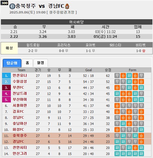 경기 흐름은 경남 공세에 충북 수비 기반 응수 → 세트피스 및 혼전 속 득점 상승 가능의 구도로 전개될 수 있어요.