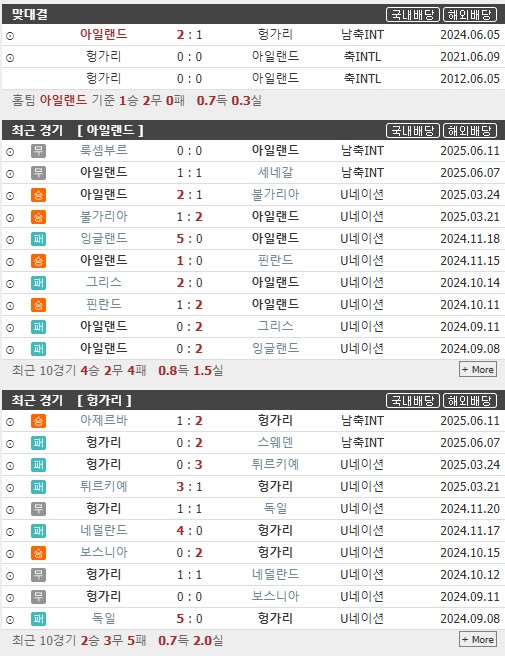 | 베팅 흐름 예측 | 언더 2.5 골 중심 – 케이지 경기 예상 | 헝가리의 찬스 제한적, 주도권 아일랜드 중심 가능성 |
